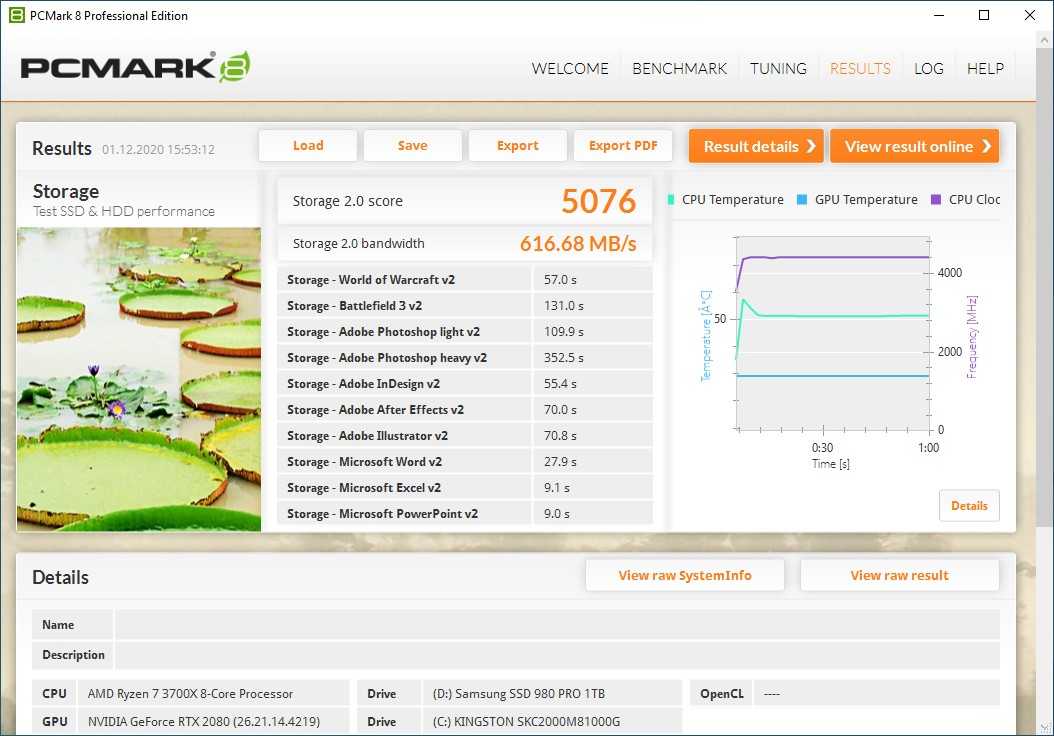 В “накопительных” тестовых дисциплинах из пакета PCMark 10 рассматриваемая модель также показывает очень хорошие результаты с высокой пропускной способностью и отзывчивостью SSD. Samsung 980 PRO отлично подходит в качестве системного накопителя или скоростного раздела для установки объемных ресурсоемких игр.