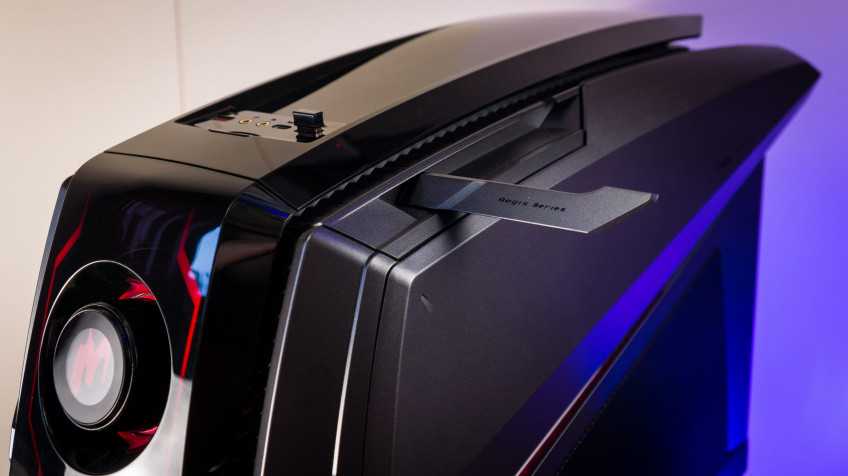 При этом внутри, под пластиком, скрыт стандартный металлический корпус примерного такого же формата, как у mini-Tower под mATX-платы. Сзади сверху к нему на винтах прикручена мощная ручка, за которую компьютер можно без опаски переносить с места на место. Сзади снизу, под пластиковой накладкой, прячется слот под жёсткий диск, а в круглой ноге — место под блок питания. На пол конструкция опирается металлической ногой с резиновой проклейкой, не дающей скользить. По жёсткости к конструкции нет вопросов, но физику всё же не обманешь: верхняя часть немного пружинит под собственным весом. Также заметим, что у передней панели сверху есть два выдвигающихся держателя для наушников. В длину они 9 см, так что на них поместятся гарнитуры даже с самым широким оголовьем.