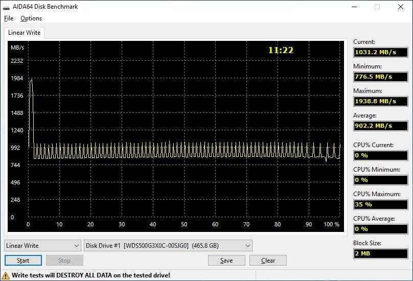 Обычно, когда у накопителя заканчивается SLC-кэш, оставшийся дисковый объём он пишет в TLC-режиме, но при этом параллельно приходится переписывать данные, записанные в режиме SLC, в режим TLC, что выливается в двойную работу для контроллера. У Western Digital Black SN750 хотя и мало SLC-кэша, но он выделенный. После того, как «быстрые» гигабайты закончатся, и скорость записи упадёт с ~2000 МБ/с до ~950 МБ/с, весь оставшийся объём он пишет с постоянной скоростью, что отчётливо видно на графике AIDA64 Disk Benchmark. В ином варианте «быстрых» ГБ больше, но потом скорость падает на самое дно до ~300 МБ/с.