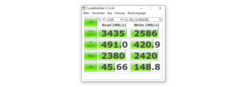 Наконец, самая нижняя строка, которая становится камнем преткновения даже для самых скоростных накопителей. Это хаотичное чтение и запись одним потоком маленьких файлов по всему диску. В таком режиме подавляющее большинство дисков показывает скорость работы в считанные проценты от заявленной максимальной. Наглядный пример — наш подопытный: при последовательных операциях с большими файлами он практически подобрался к потолку скорости для интерфейса (3,94 гигабайта в секунду для четырех линий PCI Express), тогда как результат теста 4KiB Q1T1 составил всего 50 мегабайт в секунду. И это нормально.
