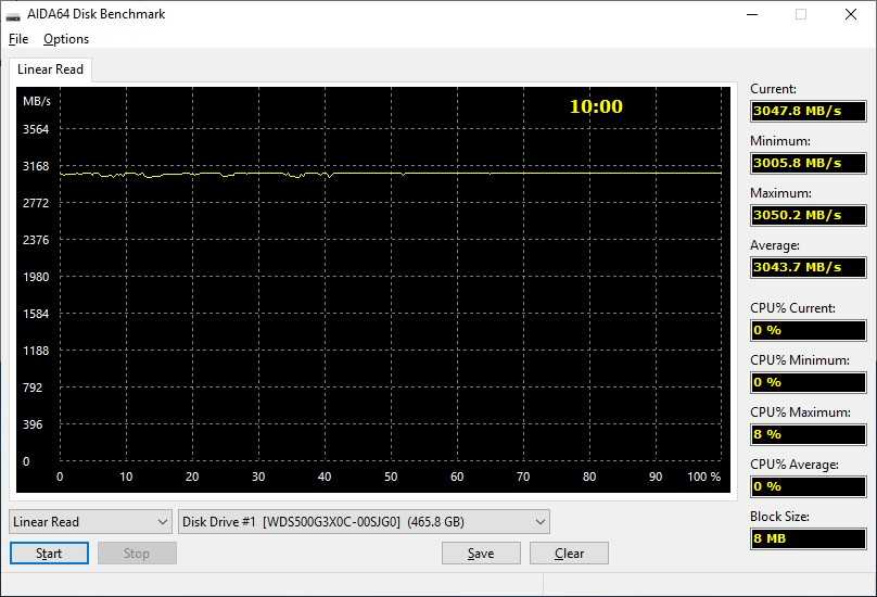 Согласно графику последовательной скорости чтения, накопитель может выдавать на гора порядка 3000 МБ/c. Фиксируем этот результат.