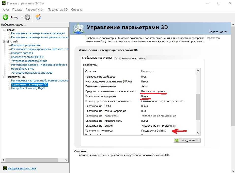 Переходим в Параметры 3D пункт «Управление параметрами 3D«.Выставляем:Предпочтительная частота обновления — Высшая доступнаяРежим низкой задержки — Выкл.Технология монитора — Поддержка G-SYNCЖмём применить и закрываем панель управления NVIDIA.