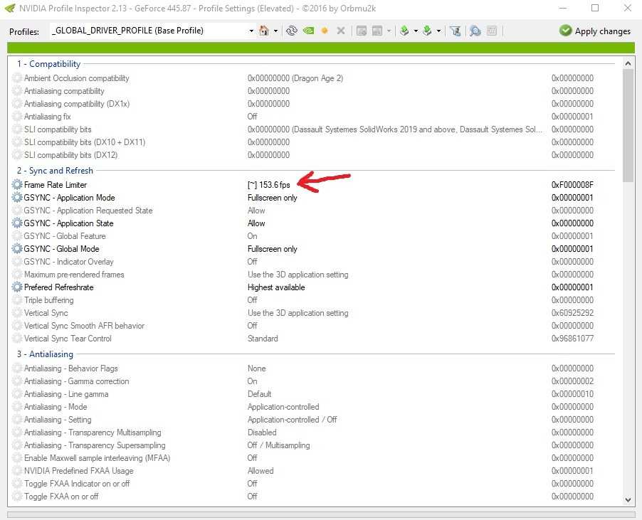 - Скачиваем NvidiaInspector.Запускаем nvidiaProfileInspector.exe от имени Администратора.Дожидаемся загрузки(полностью исчезнет зеленый ползунок внизу окна)В пункте Frame Rate Limiter выставляем 153,6fpsНажимаем Apply changes. Закрываем.