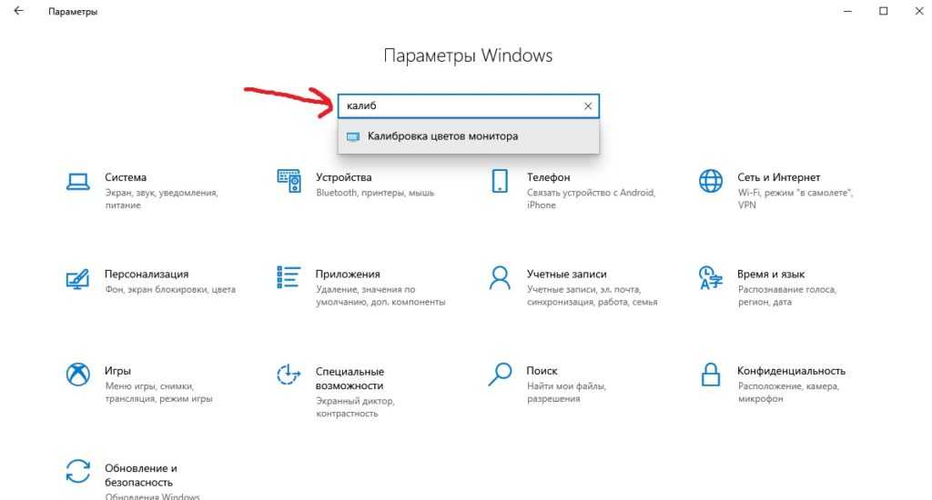 - Заходим в параметры Windows и в поиске пишем «Калибровка цветов монитора«