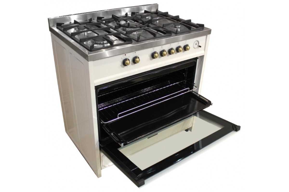 Лучшая газовая плита с электрической духовкой, относящаяся к премиум-классу, окрашена в бежевый цвет и имеет латунную отделку. Варочная поверхность изготовлена из нержавеющей стали, корпус эмалированный. Аналоговый таймер и механический термостат предотвращают пригорание пищи и обеспечат качественное выпекание в духовке.