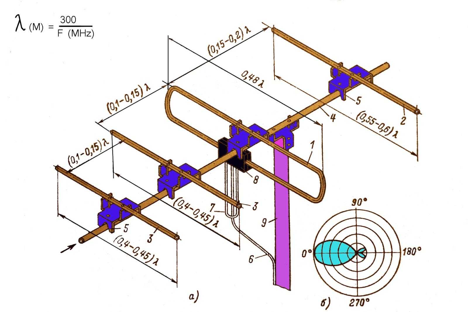 Конструкция состоит из нескольких элементов: медный провод (или трубка), директор, рефлектор и вибратор