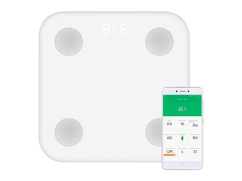 - Xiaomi Mi Body Composition Scale. Для изготовления корпуса используются стекло и металл. Устройство долговечное, качественное, показатели точные. Есть возможность подключения к смартфону по Bluetooth.