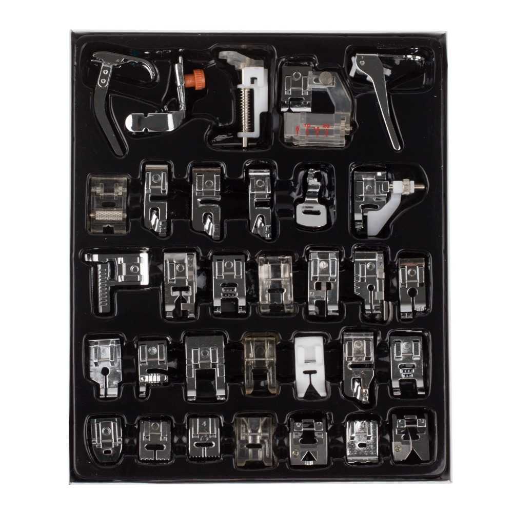 Хотя такая швейная машина относится к бытовым, у нее, как у промышленных моделей, используется двойной механизм подачи ткани – это очень упрощает процесс шитья. Кстати, в комплекте, помимо основной лапки, есть еще 7, подходящих для разных целей вроде вшивания молнии, пуговицы и т.д.