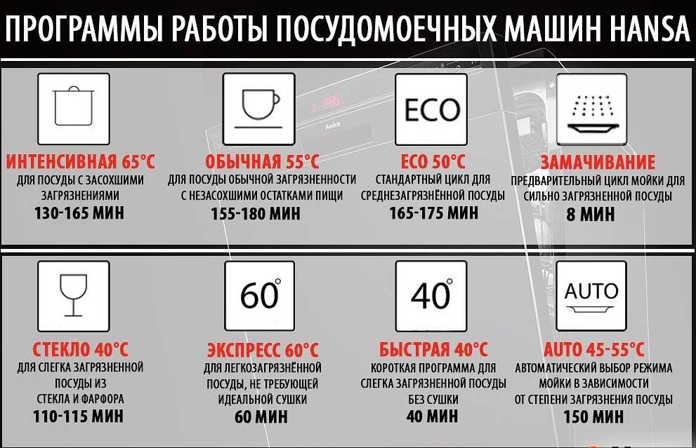 Режимы мытья отличаются объёмом используемой воды, температурой её нагрева, продолжительностью процесса, интенсивностью применения бытовой химии. Стандартный вариант включает 4-5 программ, которые позволяют выбрать алгоритм с учётом загрязнения кухонной утвари, времени завершения процесса. Топовые модели имеют систему управления с 7-9 предустановленными программами. Эта техника актуально для тех, кто пользуется разной посудой – из тонкого стекла, фарфора, керамики, пластика.