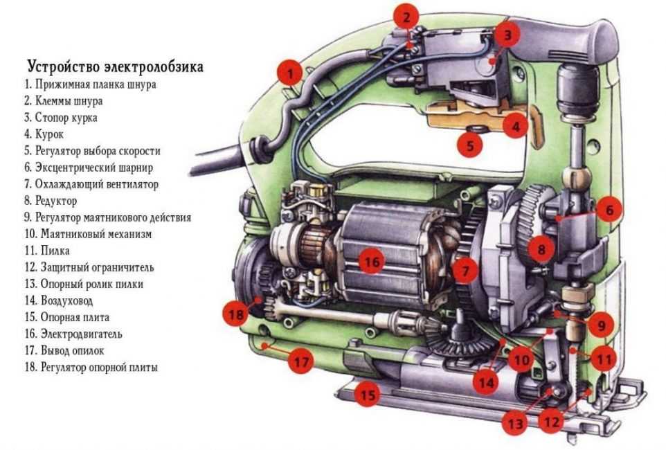 Как выглядит лобзик, знает каждый домашний мастер. А вот как он устроен, имеет смысл разобрать. Основой этого оборудования является электродвигатель, который через редуктор вращает колесо-эксцентрик (ролик со смещенным центром). Именно эксцентрик передает возвратно-поступательные движения на полотно.