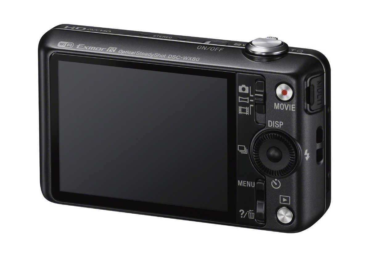 Sony Cyber-shot WX80 — 16,2 эффективных мегапикселя, CMOS-матрица Exmor R, объектив Carl Zeiss Vario-Tessar с 8-кратным оптическим зумом, улучшенная оптическая система стабилизации Optical SteadyShot, съемка видео в формате Full HD, режим Superior Auto, поддержка Wi-Fi, фильтр Beauty Effect, технология Advanced Flash, представлена в черном цвете.
