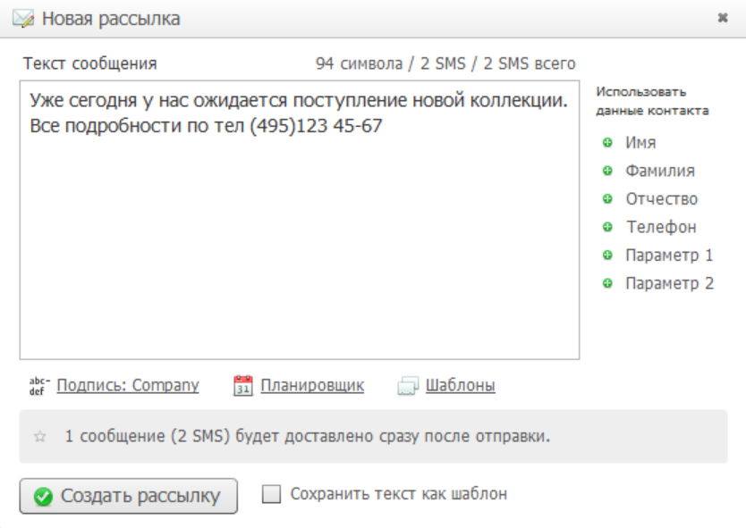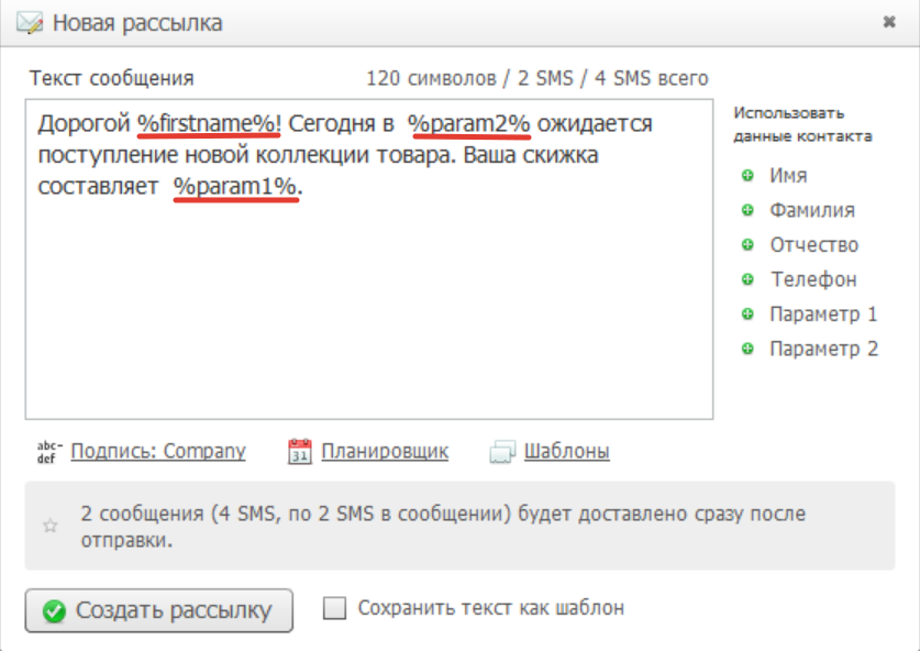 Для этого при создании рассылки непосредственно в тексте нужно поставить курсор и нажать нужный из параметров. Каждый клиент получит сообщение с нужным параметром, который указан в адресной книге.