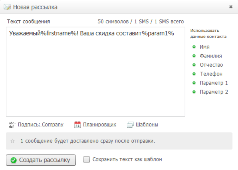 Одной из важных функций является персонализация сообщений. Можно использовать данные контакта, такие как имя, фамилия, день рождения, параметр 1 и параметр 2. Для использования персонализации сообщений достаточно нажать на нужную кнопку-ссылку из меню формы ввода текста справа.