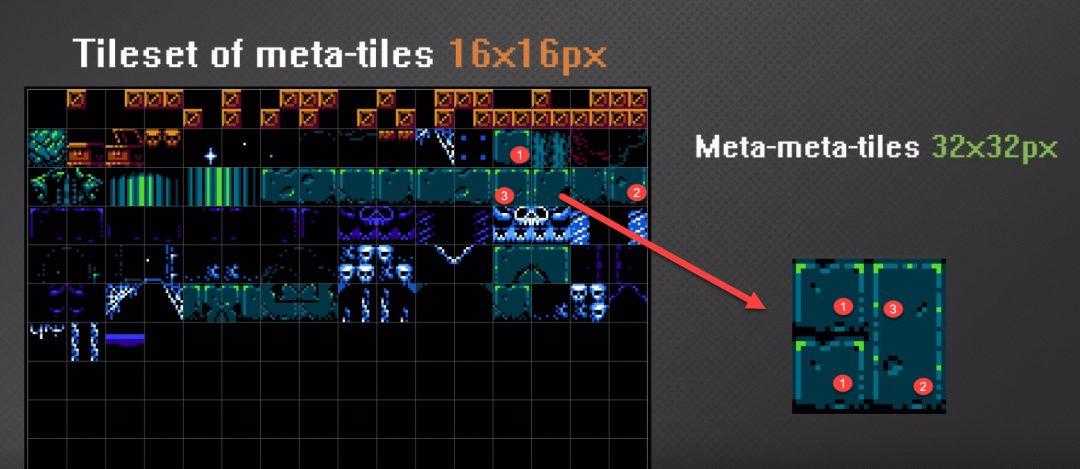 Главная задача на этом этапе — максимальная экономия видеопамяти. Для этого каждый экран с уровнем игры разбивается не на метаплитки 2 × 2, как в примере выше, с персонажем, а на метаметаплитки или суперплитки — 4 × 4 ячейки. Вот для чего это нужно: