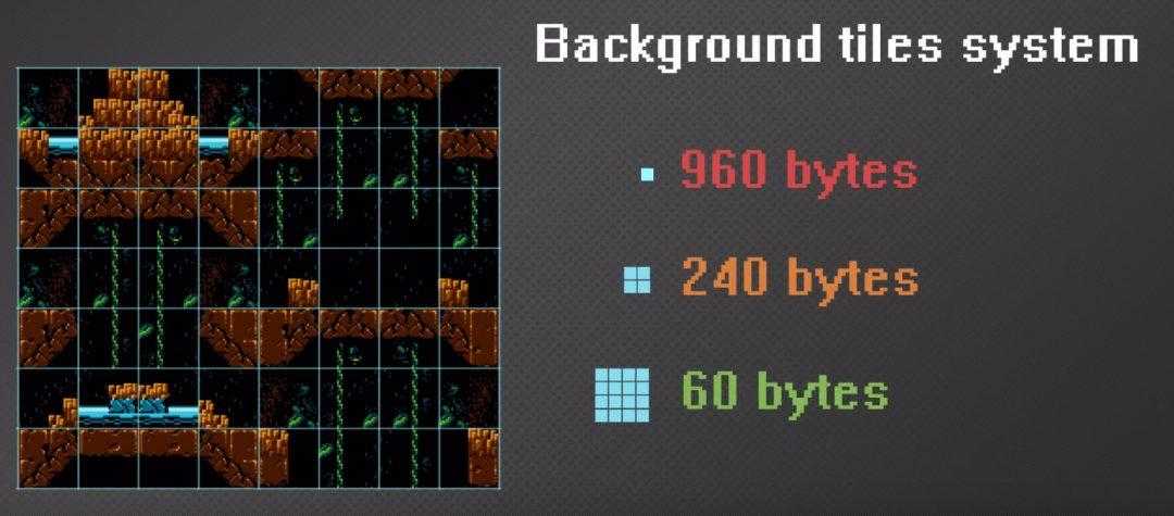 Если разбить просто на квадратики 8 × 8, как в памяти, то вся видимая на экране часть уровня займёт 960 байт. Это почти килобайт, и это очень много.