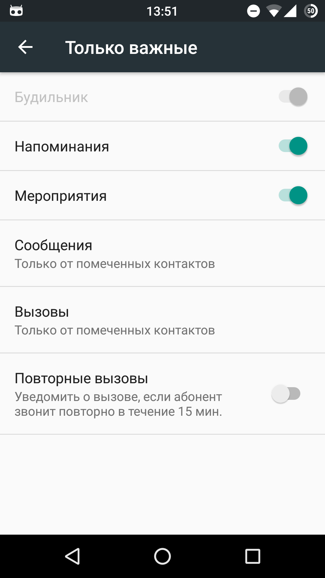 Открываем быстрые настройки, нажимаем на пункт «Не беспокоить», в открывшемся меню нажимаем «Настройки», выбираем раздел «Только важные». На экране среди прочих настроек ты увидишь два пункта: «Сообщения» и «Вызовы». По умолчанию в них указано «Только от контактов», это означает, что звонки и сообщения будут приняты от всех, кто есть в контактах. Лучшим выбором будет «Только от помеченных контактов», то есть тех, кого ты отметил звездочкой в диалере. Можно выбрать и «Ни от кого».