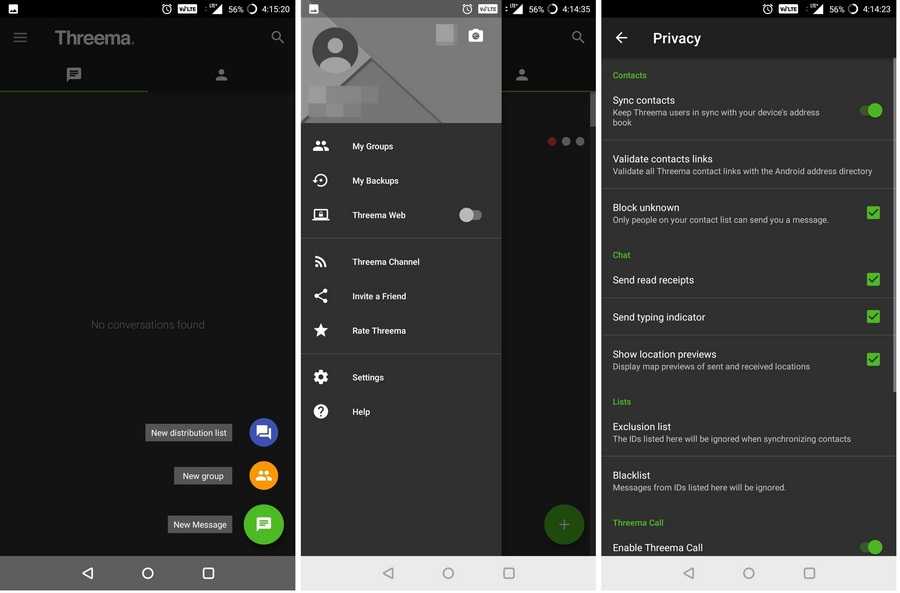 Threema — мессенджер, который использует швейцарское правительство. Все данные, которые передает Threema (сообщения, звонки, мультимедийные файлы и даже статусы контактов), шифруются на пользовательских устройствах.Хотя этот мессенджер централизованный, его сервер выступает как коммутатор: сообщения проходят через него, но не хранятся там постоянно.Для регистрации в Threema не нужно указывать данные, при помощи которых можно установить личность пользователя. Также не понадобится ни анонимная электронная почта, ни SIM-карта. Вместо этого, при первом запуске приложения пользователю присваивается случайный идентификатор.В дополнение к обмену текстовыми сообщениями, пользователи Threema имеют доступ к голосовым звонкам, могут делиться геолокацией, голосовыми сообщениями и файлами. Поддерживаются групповые чаты до 50 человек.