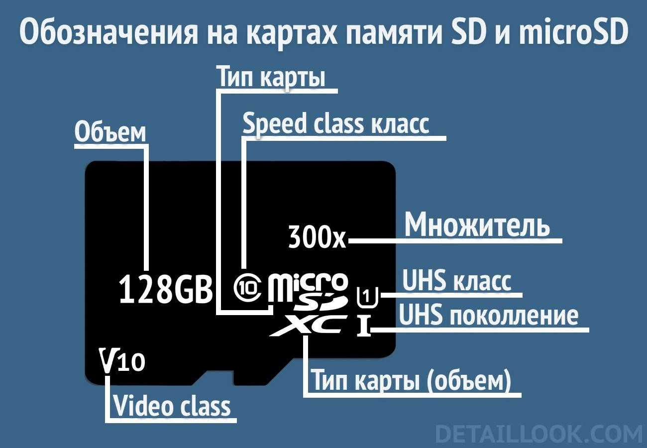 Основные показатели — класс скорости, класс совместимости с устройствами и поддержка интерфейса UHS-I — их расположение видно на схемах выше.
