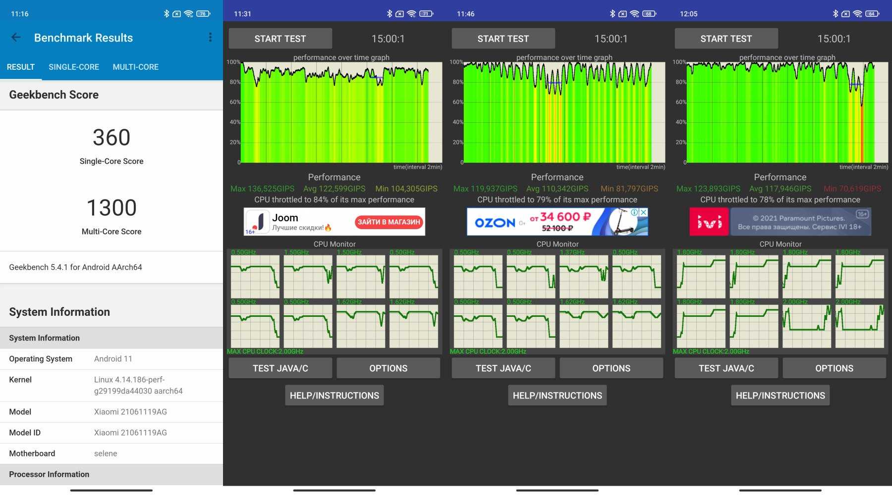 Здесь используется процессор Dimensity 900 – 6 нм, два ядра Cortex-A78 на 2400 МГц и шесть ядер Cortex-A55 на 2000 МГц. CPU набирает 710 баллов в одноядерном режиме в бенчмарке GeekBench 5 и 2159 балл в многоядерном режиме. Результат в AuTuTu 9 – почти 426 тыс. баллов. Анонс чипа состоялся в мае 2021 г.