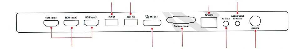 - Входной порт — HDMI 2.0 x3; AV х1; VGA x1 аналоговое/цифровое телевидение (DTMB) x1