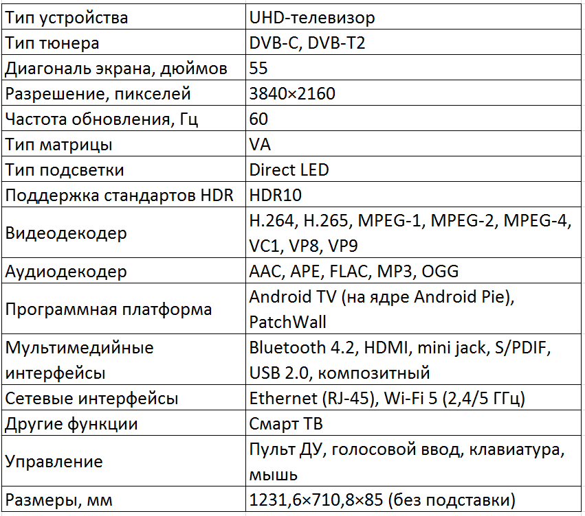 Разрешение картинки 3840×2160, что соответствует 4K UltraHD. Формат экрана с VA матрицей при этом 16:9. Частота обновления оптимальная – 60 Гц, углы обзора 178°/178°. Платформа Smart TV дополнена операционной системой Android TV с понятным интерфейсом. Память – 2/8 Гб, установлено ПО PatchWall.