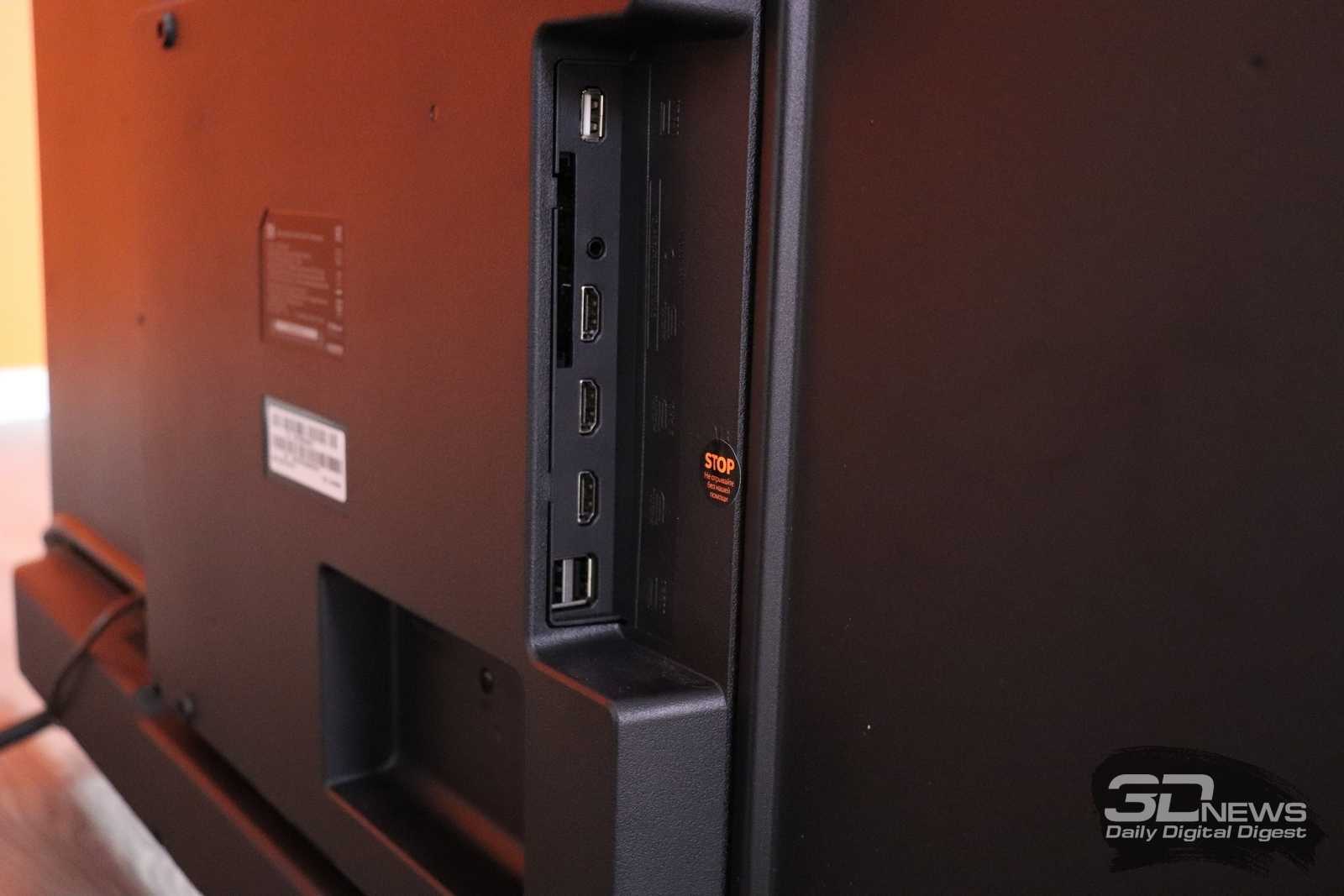 На задней стенке расположились три порта HDMI версии 2.0, три USB 2.0, антенный вход и стандартное добро наподобие гнезда для наушников. Разъемы находятся на двух площадках по центру телевизора – и системы, чтобы «припрятать» кабели, не предусмотрено.