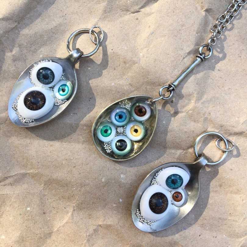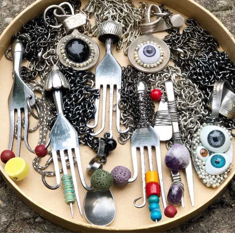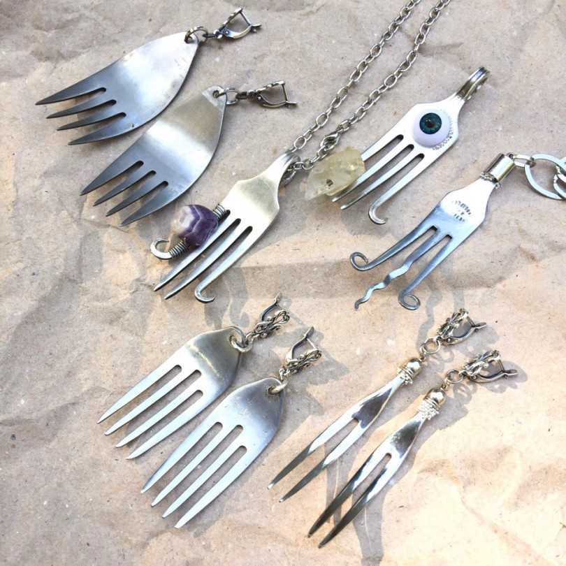 Браслет. Для его изготовления необходимо отрезать фрагмент ложки или вилки и согнуть ее дугой нижнего диаметра. Далее нужно сделать два отверстия и скрепить браслет посредством соединительного колечка.