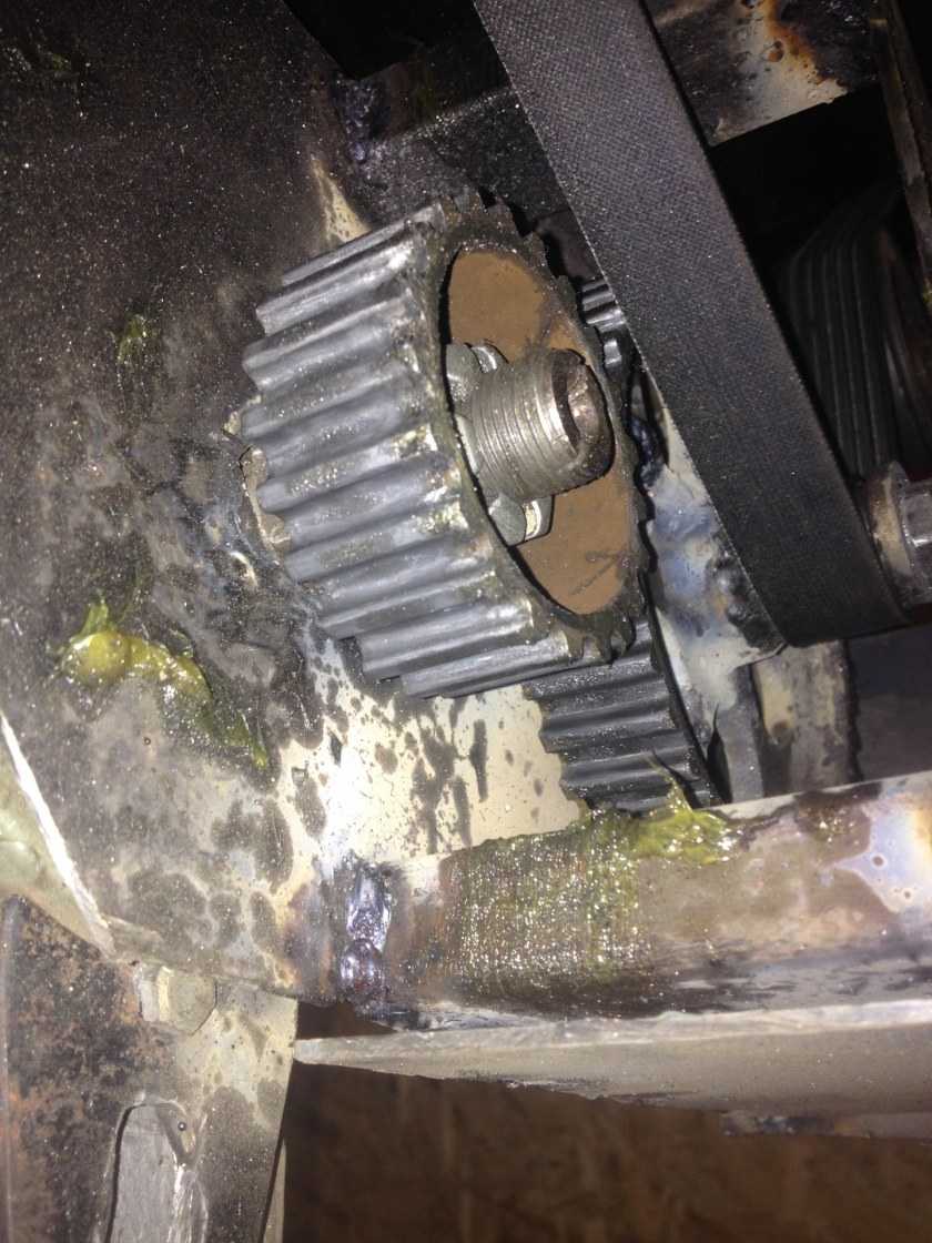 - В посадочное место устанавливаем сборку — маленькую шестерню, соединенную с колесом для ременной передачи.