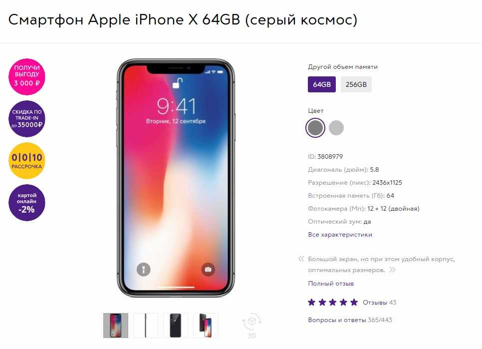 Например, iPhone Xs представлен сразу в трех цветах: «золото», «серебро» и «серый космос». Внутренняя память его может быть разной: 64 Гб, 256 Гб и 512 Гб. Точно так же, как и страна применения.