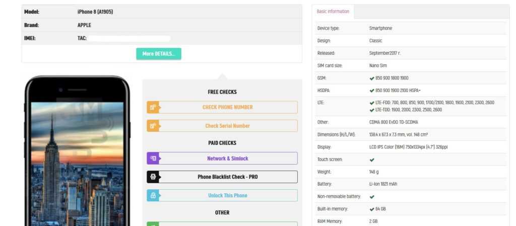 Если IMEI указан верно, появится подробная информация о данном смартфоне. Вы увидите дату релиза, основные характеристики, модель аппарата и другие данные.