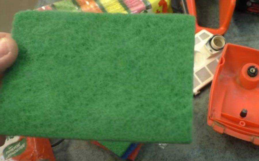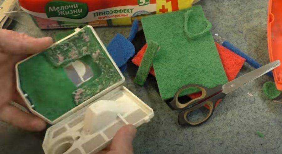 На самом деле тут все предельно просто. Берем губки, от которых нужно оторвать крупноячеистый поролон (мягкую часть), или фибровые салфетки, и вырезаем из этих заготовок фильтрующий элемент по размерам корпуса стационарного фильтра.