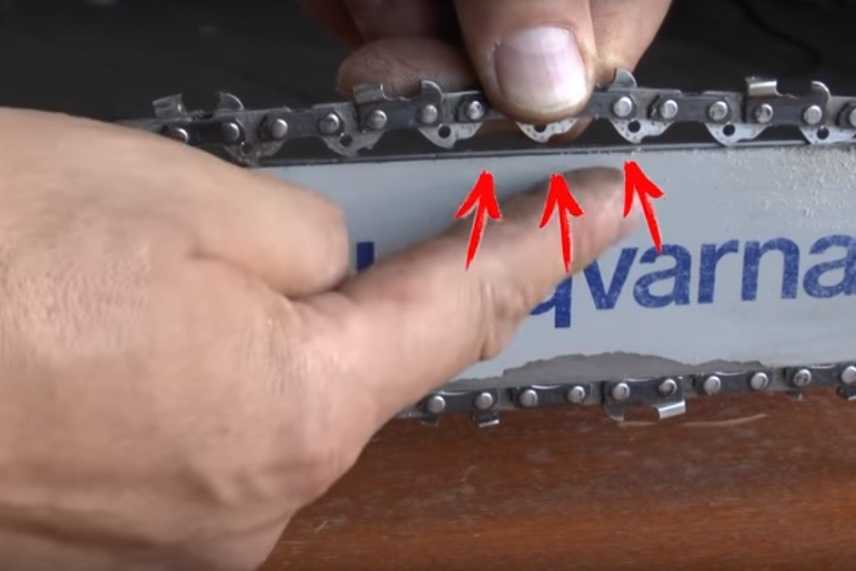 Каждая бензопила нуждается в том, чтобы регулярно осуществлять натяжение цепи. Если это правило не соблюдаются, то последствия могут быть очень травматическими. Большинство пильщиков знает, о чем идет речь, и как надо правильно натягивать или подтягивать цепь. Правильное натяжение режущей гарнитуры — когда при попытке ее оттягивания от шины полностью видны три хвостовика, как показано на фото ниже.