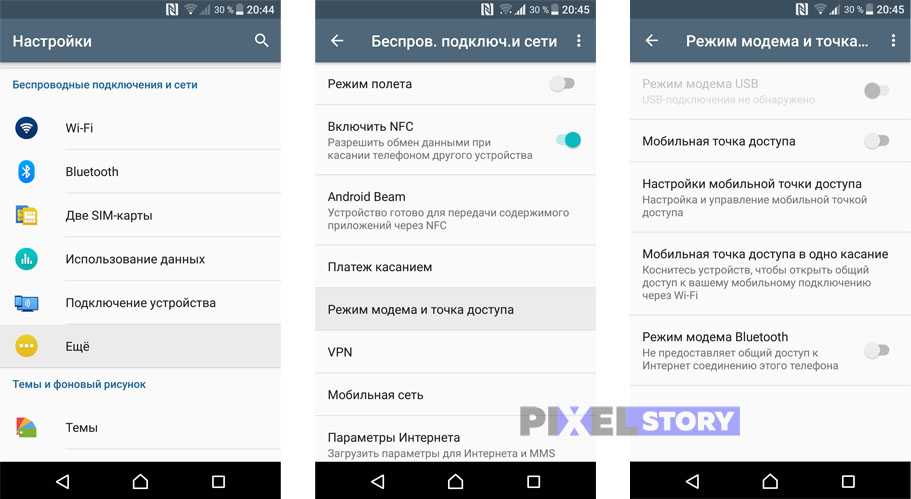 Полный путь: «Настройки — Беспроводные сети — Еще — Режим модема«.