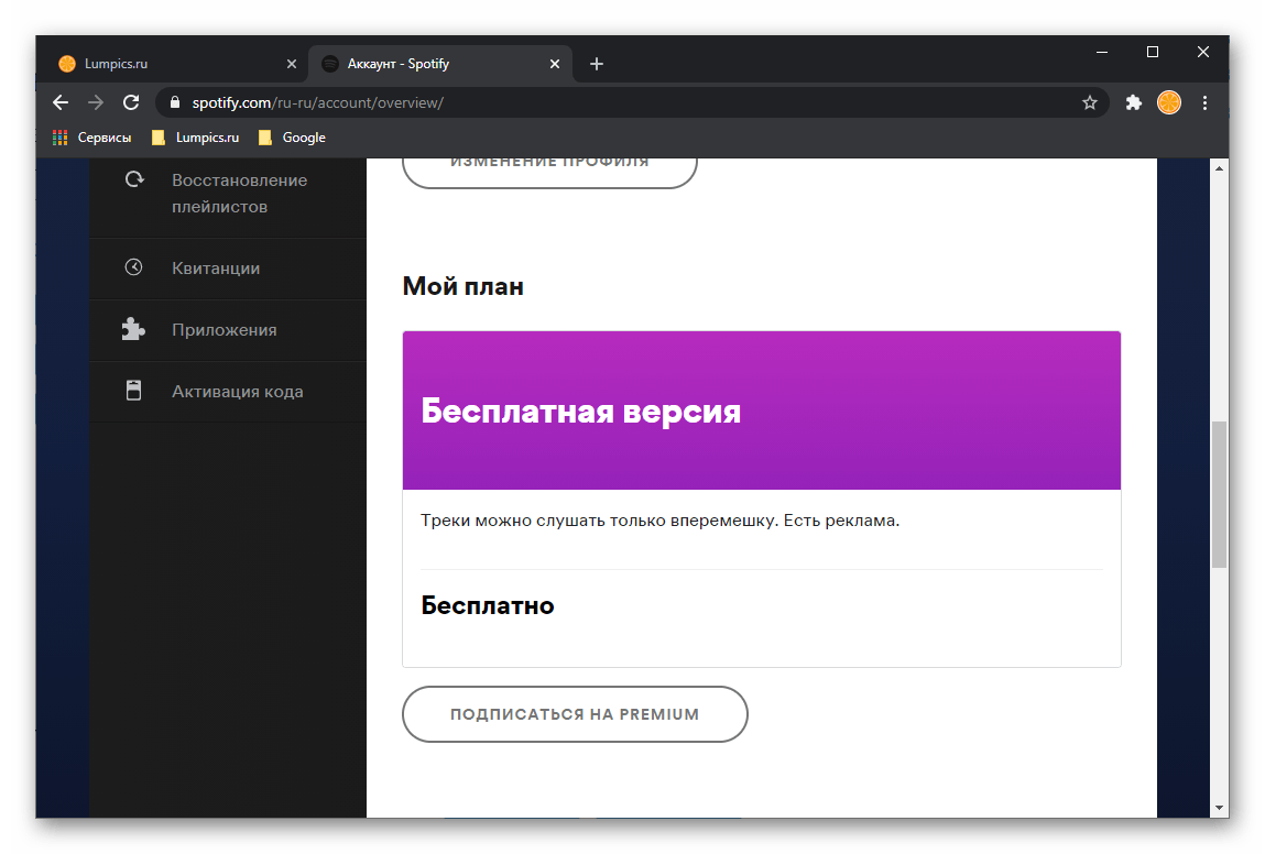 Если там будет указана «Бесплатная версия Spotify», но при этом с вашего счета списывались платежи, логично предположить, что Premium был оформлен на другую учетную запись. Чтобы найти ее, обратитесь к официальному разделу справки на сервисе, ссылка на который дана ниже.
