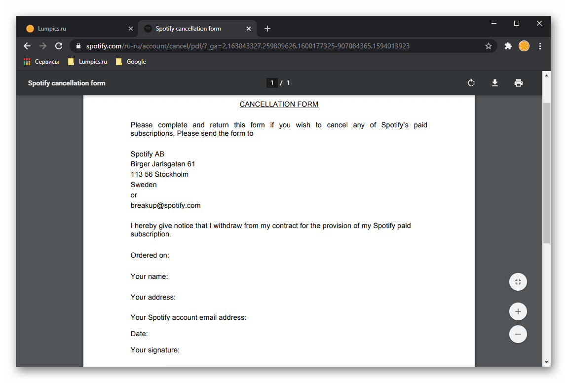 Если по каким-то причинам у вас так и не получилось отменить подписку Спотифай Премиум, заполните специальную форму и отправьте ее представителям музыкального сервиса. Для этого прейдите по представленной ниже ссылке и укажите в соответствующих полях имя того, на кого оформлялась подписка, свое имя пользователя в Spotify, адрес (актуально только для семейной и парной подписки), привязанный к аккаунту адрес электронной почты, текущую дату и свою подпись. Корректно заполненный документ нужно отправить на электронную почту breakup@spotify.com.