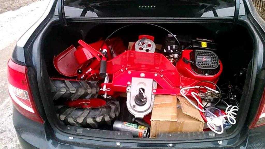 Мотоблок имеет большие габариты с выступающими деталями. Частичная разборка аппарата для земельных работ (снятие ручек и колес – плугов), позволит его поместить в багажник большинства марок автомобилей. Для этого достаточно разложить задние сиденья.