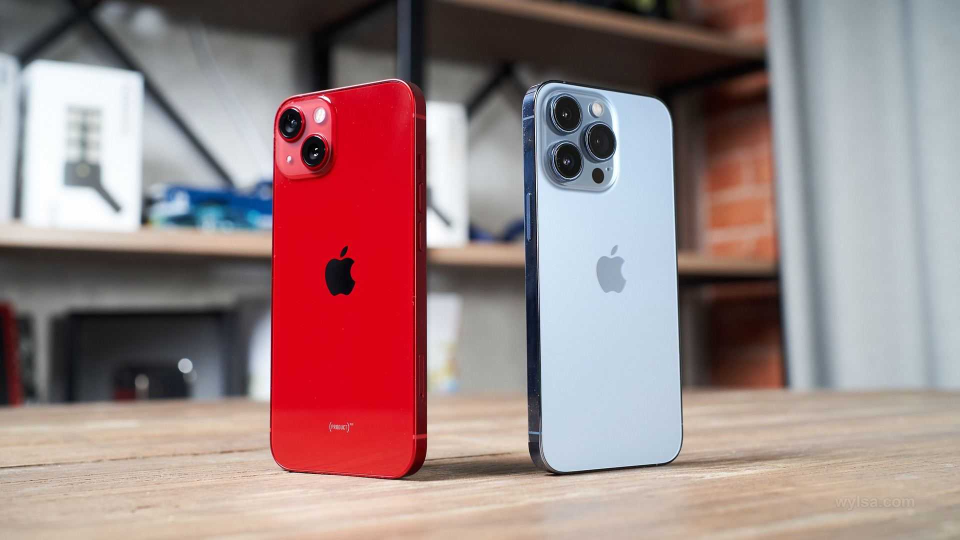 Спереди iPhone 13 и iPhone 13 Pro вообще никак не отличить — телефоны одинаковых размеров с идентичными диагоналями. Если смотреть сбоку или сзади, то отличий будет больше. Разные цвета корпуса, а также разное количество модулей камер — тут уже Pro от не-Pro не спутаешь при всём желании.