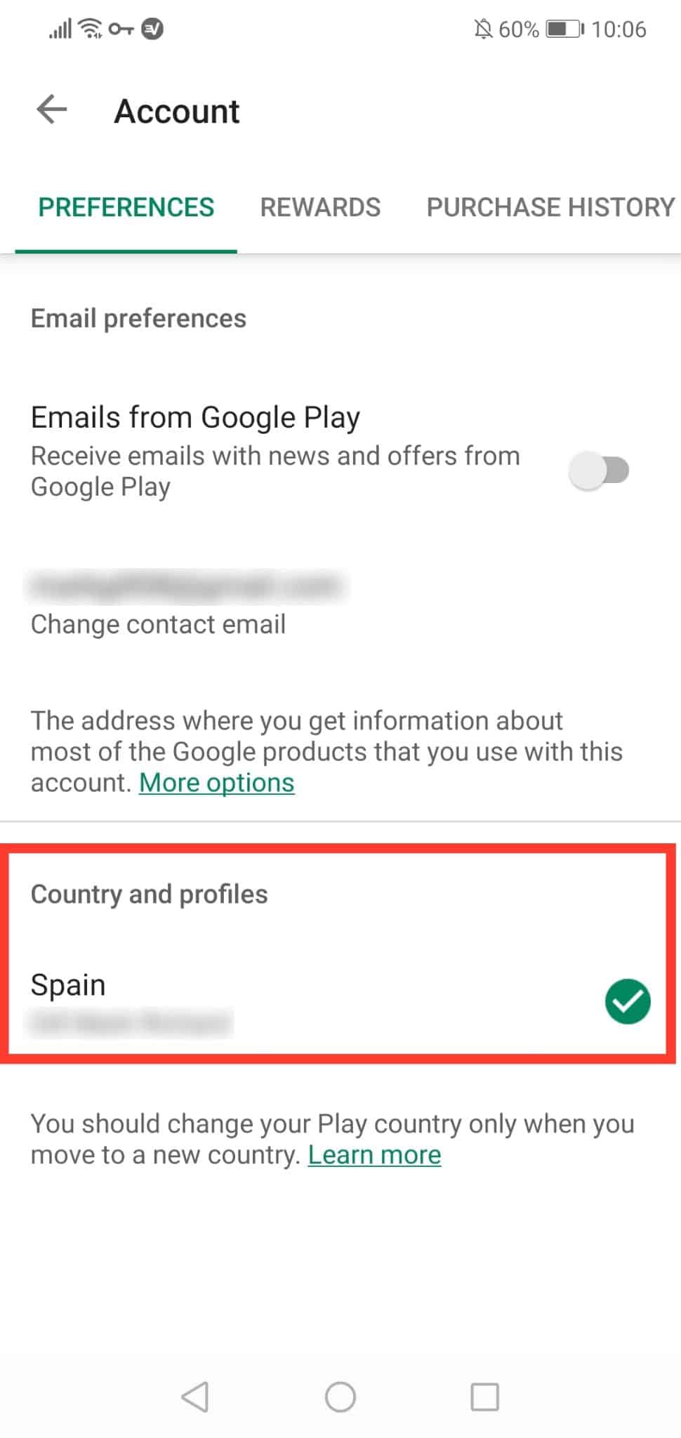 • В секции Страна и профили найдите две страны — для Google Play и текущую.