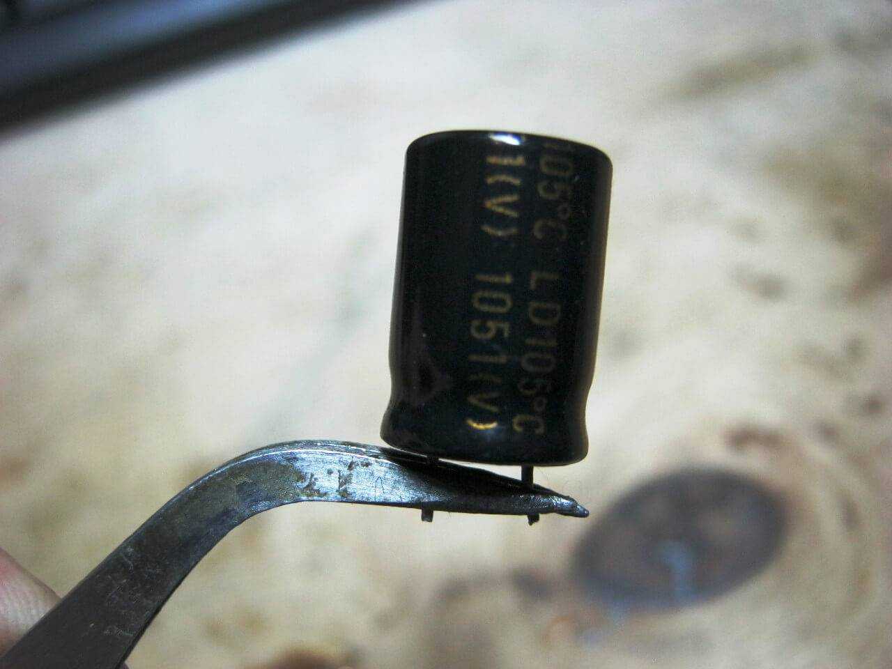Итак, сначала нужно проверить сопротивление конденсатора мультиметром. Для этого отпаиваем бочонок со схемы и с помощью пинцета аккуратно перемещаем его на рабочую поверхность, к примеру, свободный стол.