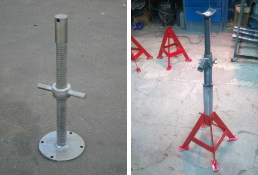 - Изготовьте стойки и упоры. Отпилите 2 детали от профилированной трубы. Длина деталей вычисляется относительно величины максимального хода штока, далее к этому прибавляется высота домкрата и опорной платформы. Упор изготавливается из того же материала. Его длина равняется ширине опорной платформы. Упор и стойки соединяются сварным швом, к основанию приваривается П-образная конструкция.