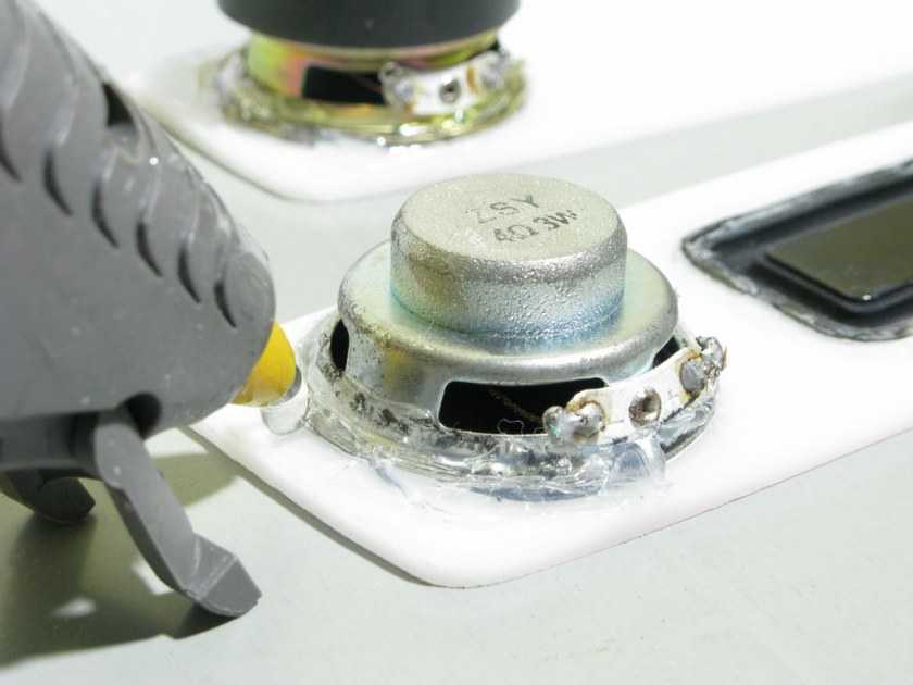 Динамики вклеиваем с помощью клеевого пистолета, здесь есть очень важный момент. Необходимо очень хорошо пройти все по краям клеем, чтобы обеспечить плотное прилегание к акриловой стенке.