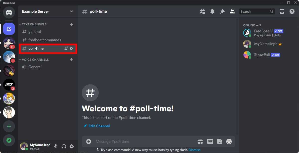 Откройте настольное приложение Discord или перейдите на сайт раздора и войдите в свой аккаунт. Перейдите на сервер, на который вы пригласили бота StrawPoll, и нажмите на канал, на котором вы хотите опубликовать свой опрос. В этом случае мы опубликуем его в текстовом канале #poll-time.