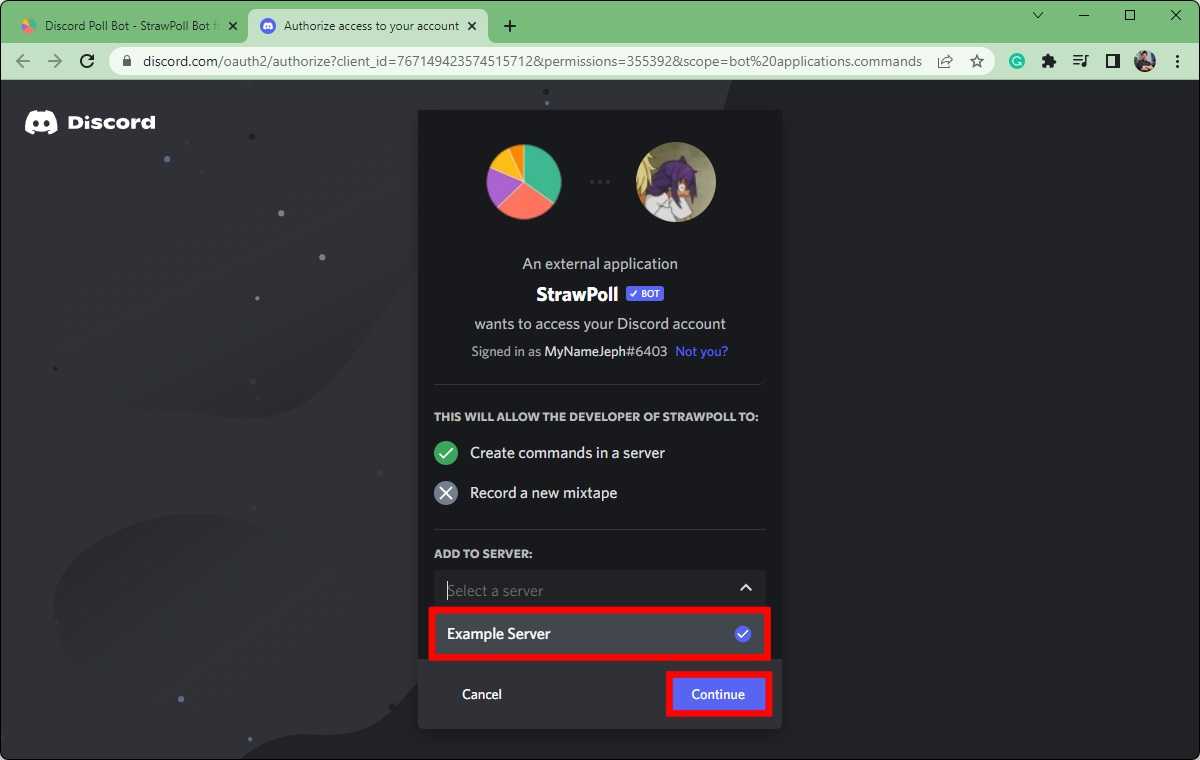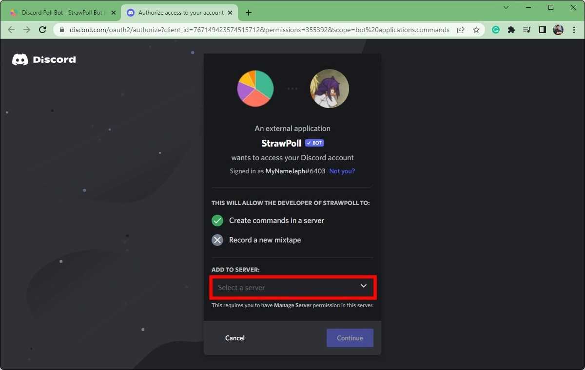 В разделе ДОБАВИТЬ НА СЕРВЕР нажмите кнопку Выбрать сервер, чтобы открыть раскрывающееся меню выбора сервера. Выберите сервер, на который хотите пригласить бота, затем нажмите «Продолжить».