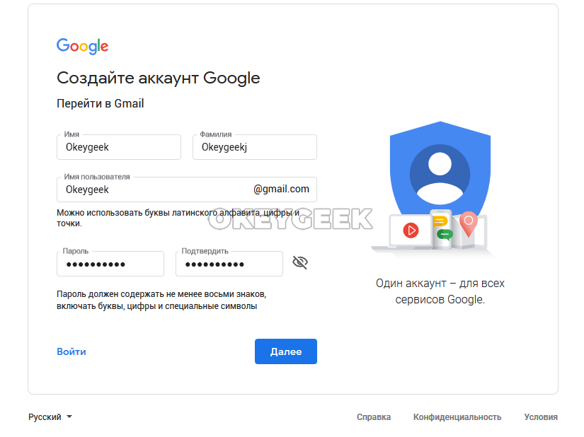 6. Придумайте имя пользователя – это будет адрес почты Gmail.