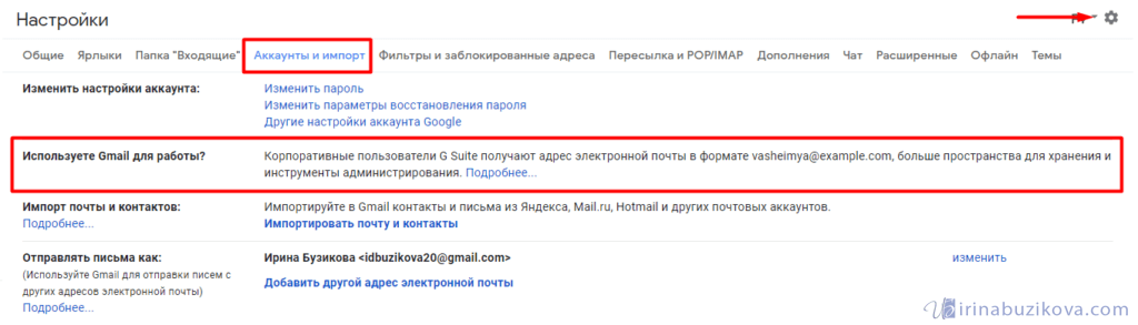 Для создания такой почты, не нужно регистрироваться заново, достаточно открыть “Настройки”, далее “Аккаунты и импорт”, выбрать “Используете Gmail для работы?”