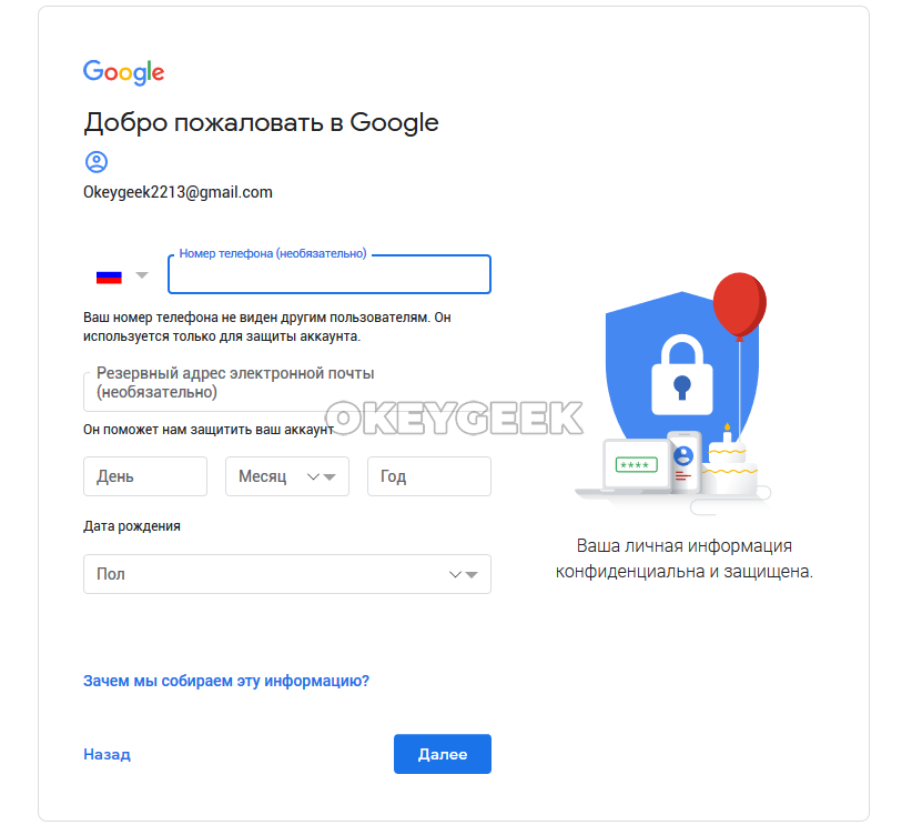 4 . Введите номер телефона – он вам понадобится для восстановления ящика в случае утери пароля. Также добавьте резервный адрес электронной почты, если он у вас имеется. Заполните дату рождения, выберите пол и нажмите «Далее».
