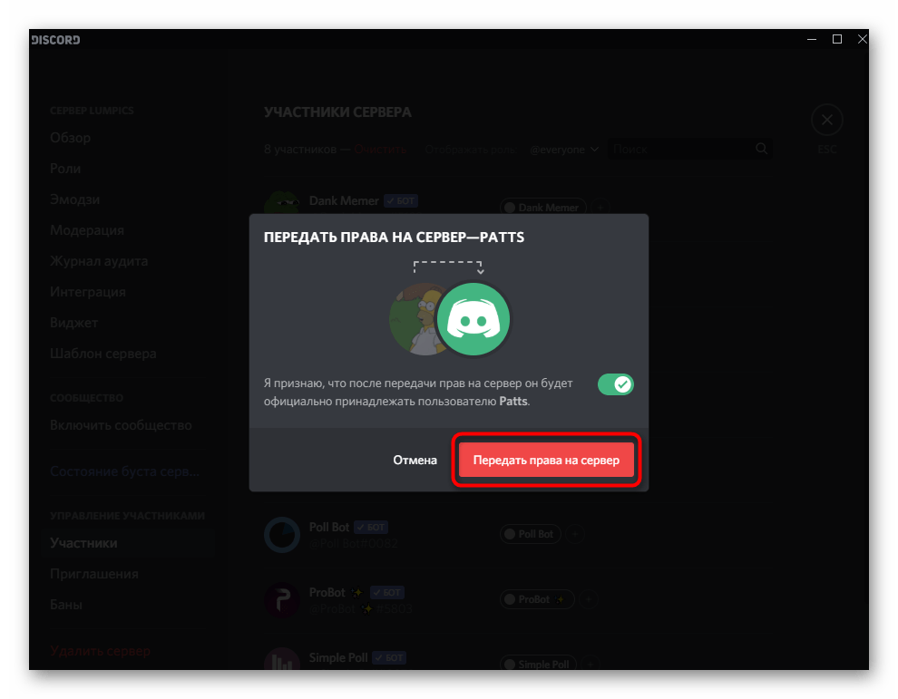 Если вы решили удалить аккаунт, с которого создавали серверы, сделать это не получится до тех пор, пока они не будут удалены или не произойдет передача прав. Для реализации первого метода, когда сервер больше не должен существовать, достаточно открыть его настройки и выбрать пункт «Удалить сервер», а передача прав, что является лучшим вариантом, осуществляется так:
