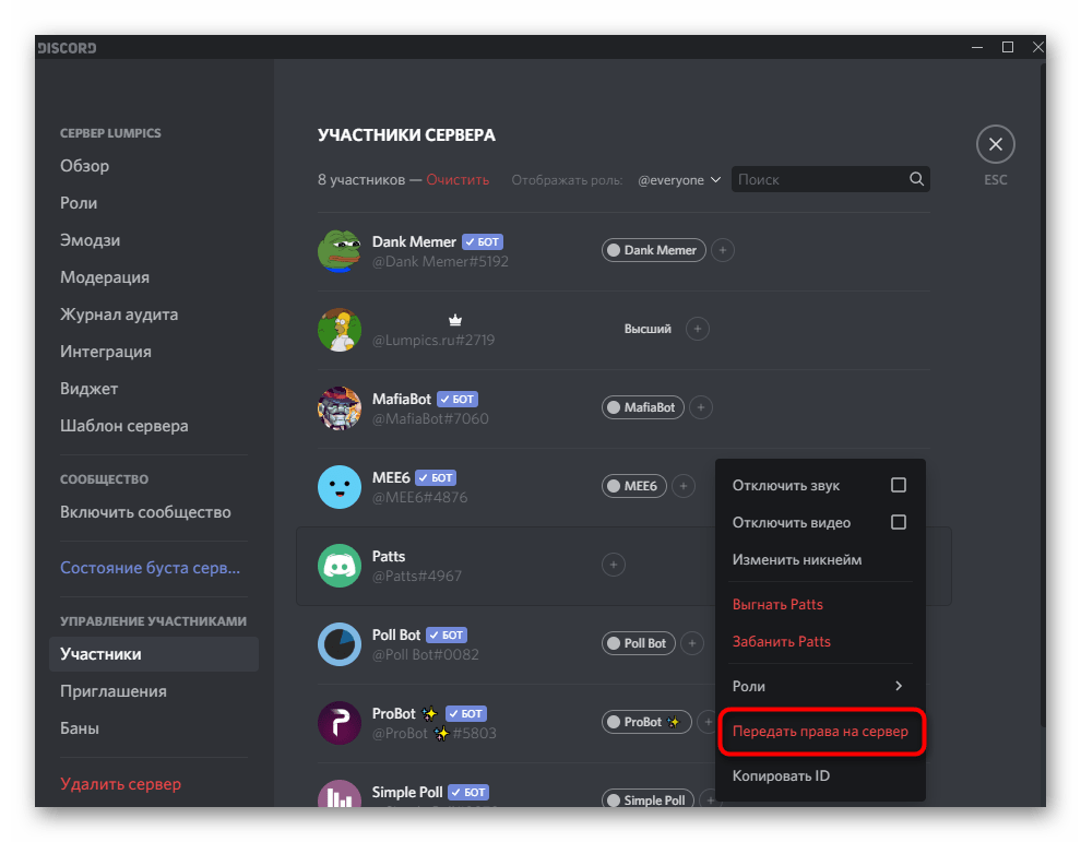 Наведите курсор на юзера, которому хотите предоставить права владельца сервера, и щелкните по кнопке с тремя вертикальными точками, появившейся справа.