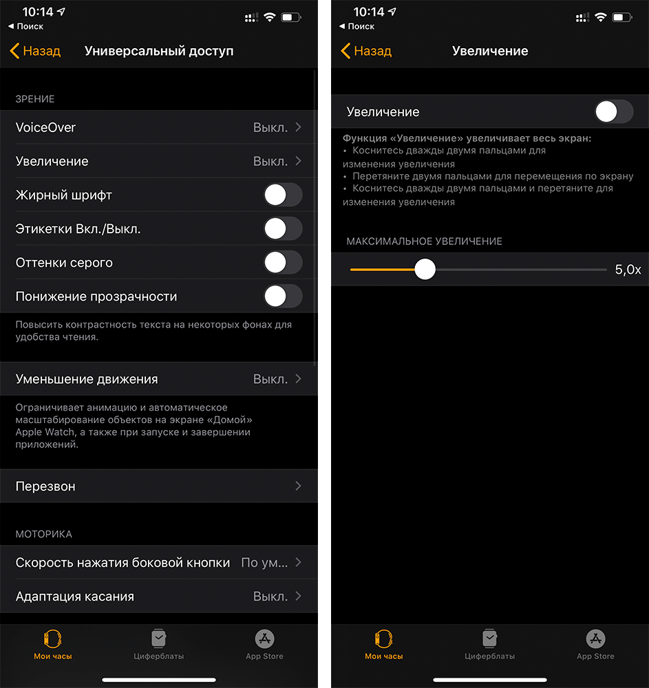 Чтобы убрать увеличение (или, наоборот, включить его, если вы в этом нуждаетесь), можно воспользоваться двумя способами. Первый — открыть приложение Watch, перейти в раздел «Мои часы» и выбрать «Универсальный доступ». Здесь в меню «Зрение» выключите или включите пункт «Увеличение».