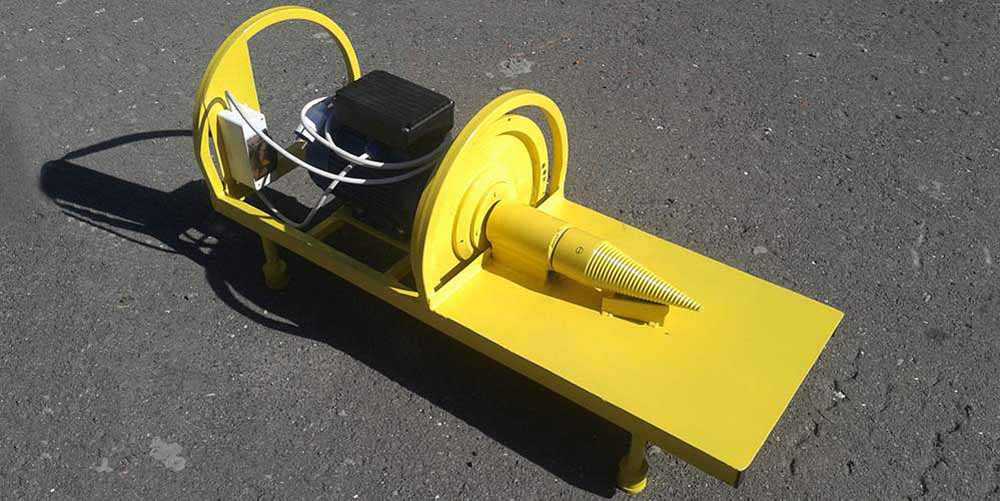 Каркас изделия имеет внушительные размеры. Это дает возможность расщеплять на станке большие бревна, крупные пеньки и бруски. Ременная передача приводит в движение конический бур, который разрывает подаваемые заготовки на части. Многие пользователи сами модернизируют агрегат. Для этого они улучшают инерцию и снижают нагрузку на двигатель. К ступице прикрепляется автомобильное колесо. Оно выполняет функцию маховика.